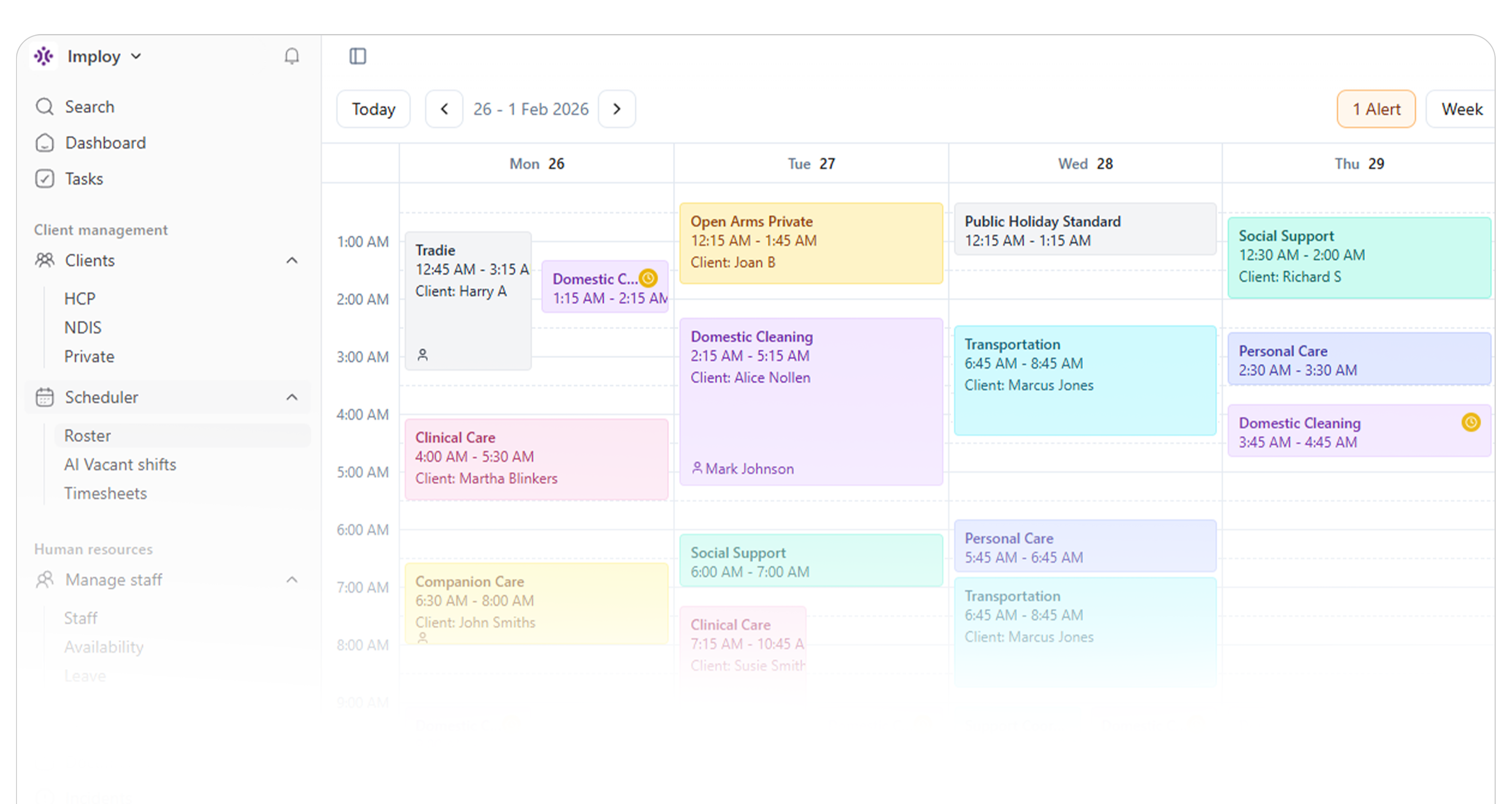 Look for software that is easy to use, offers flexibility, and integrates essential features like rostering, compliance tracking, client management, and invoicing. imploy combines all these features, helping you manage care efficiently in one platform.