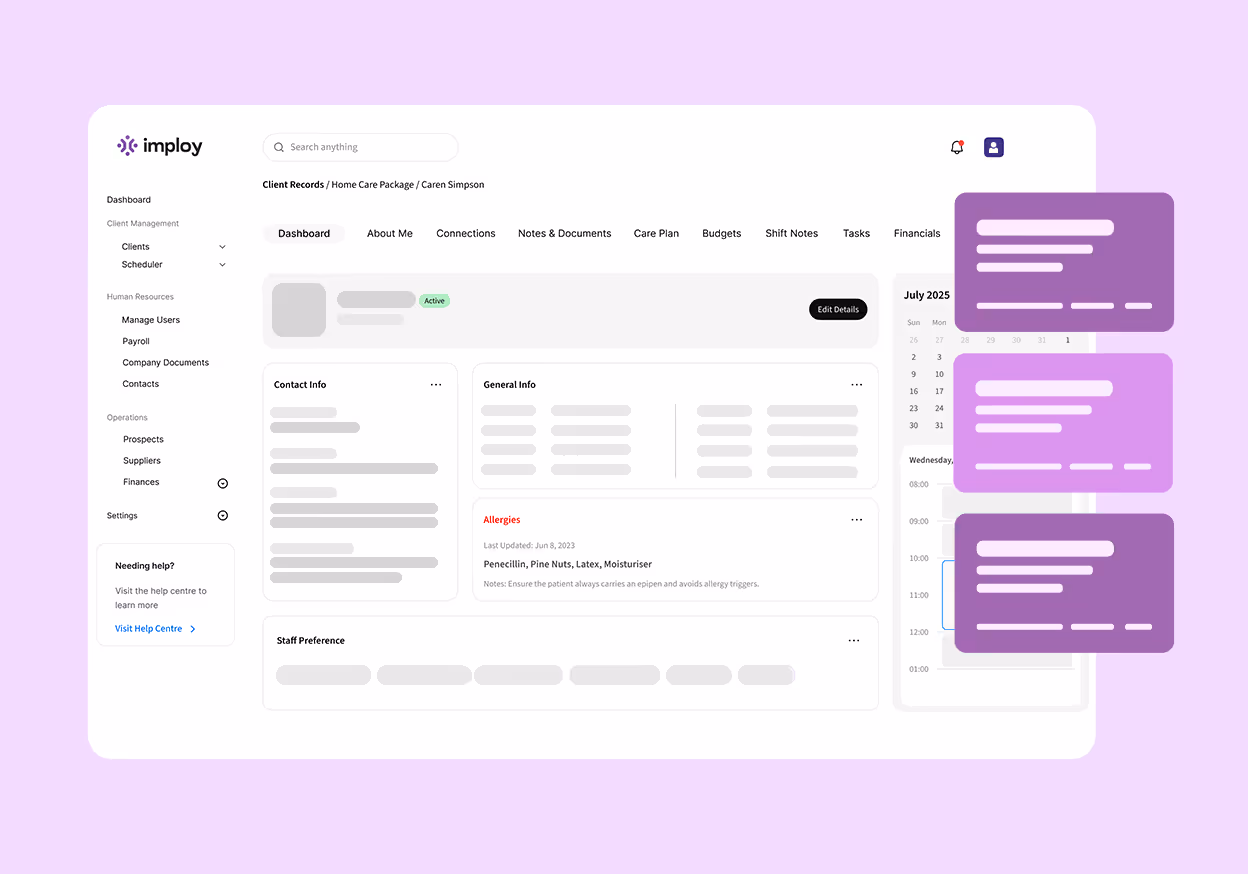 imploy’s care management system provides an all-in-one solution, including client intake and assessment, care plan creation, progress tracking, compliance monitoring, automated invoicing, rostering, and a built-in HR system. It also integrates Single Touch Payroll and offers apps for support workers and clients.