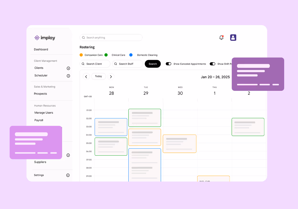 imploy gives providers everything they need to manage clients with confidence, from intake and care planning to billing, rostering, progress notes, and secure document storage. With real-time access and automation built in, imploy simplifies the entire client journey in one easy-to-use platform.