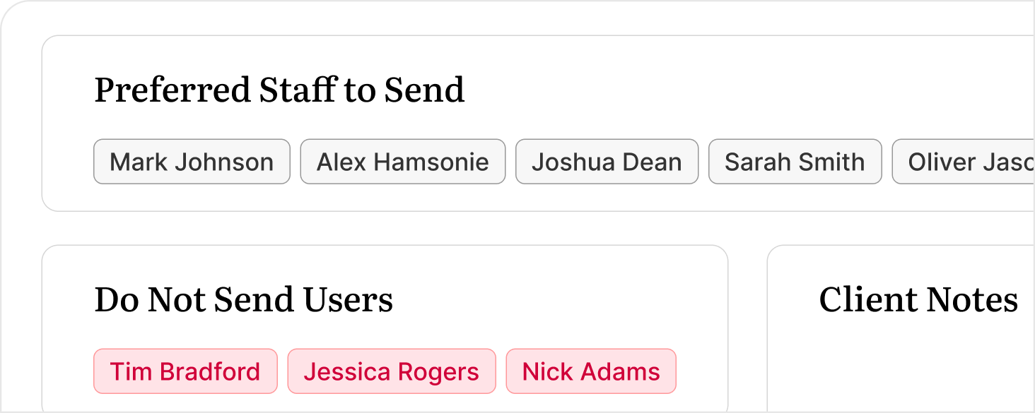 Capture client preferences and match them with the right workers to improve continuity, comfort, and outcomes for every client.