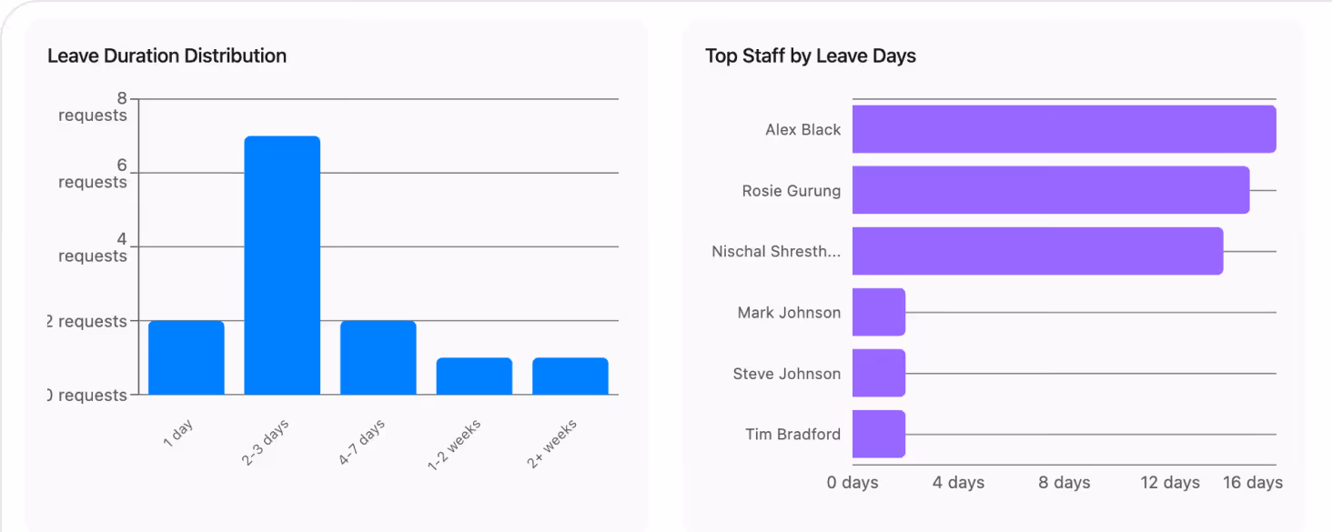 Track staff status, roles, and demographics alongside leave trends. Identify pressure points before they hit the roster, and make more informed hiring and allocation decisions.