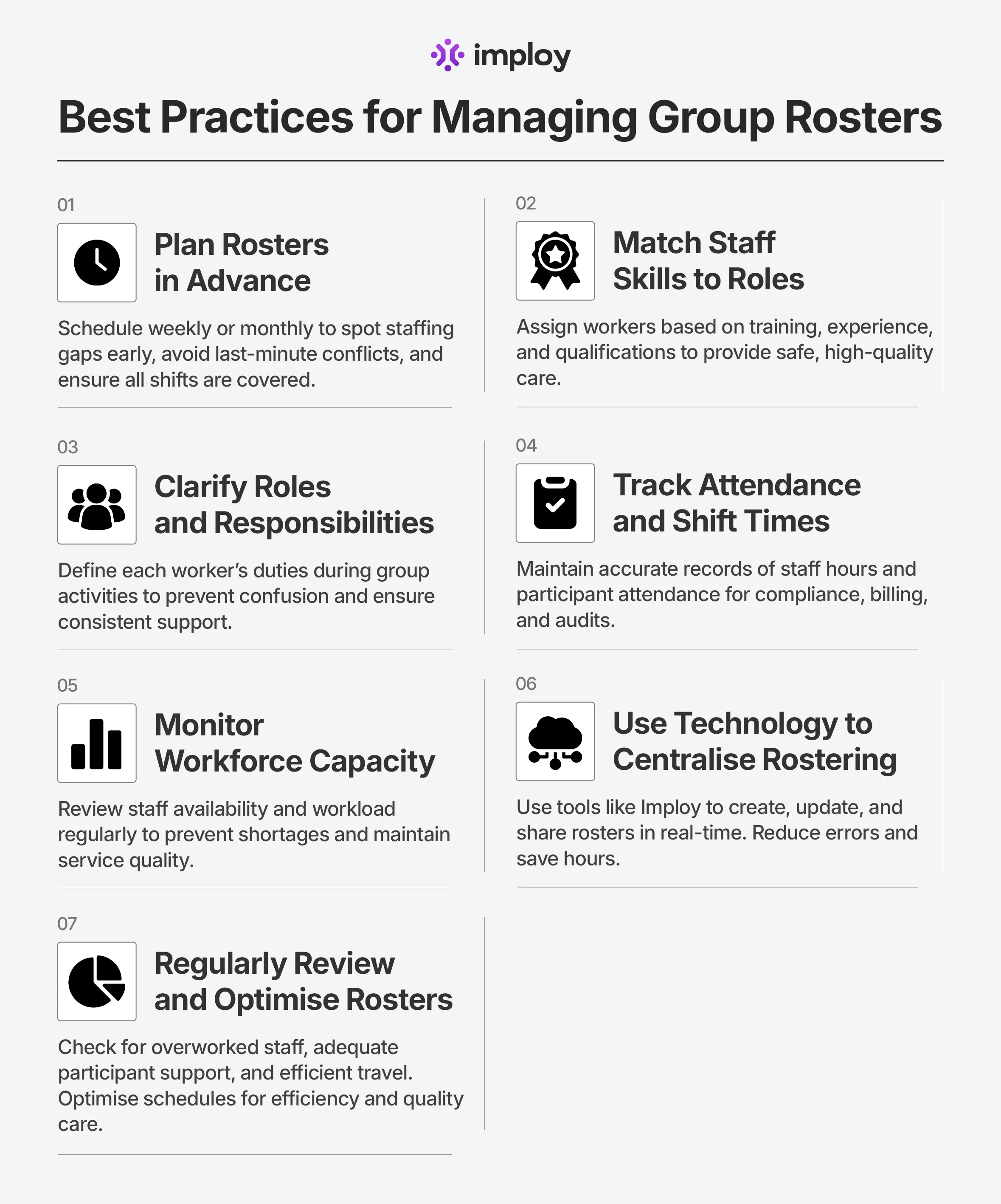 Effective group rostering ensures that participants receive consistent support while staff are utilised efficiently. Implementing the following best practices can help care providers manage multiple clients and workers seamlessly: