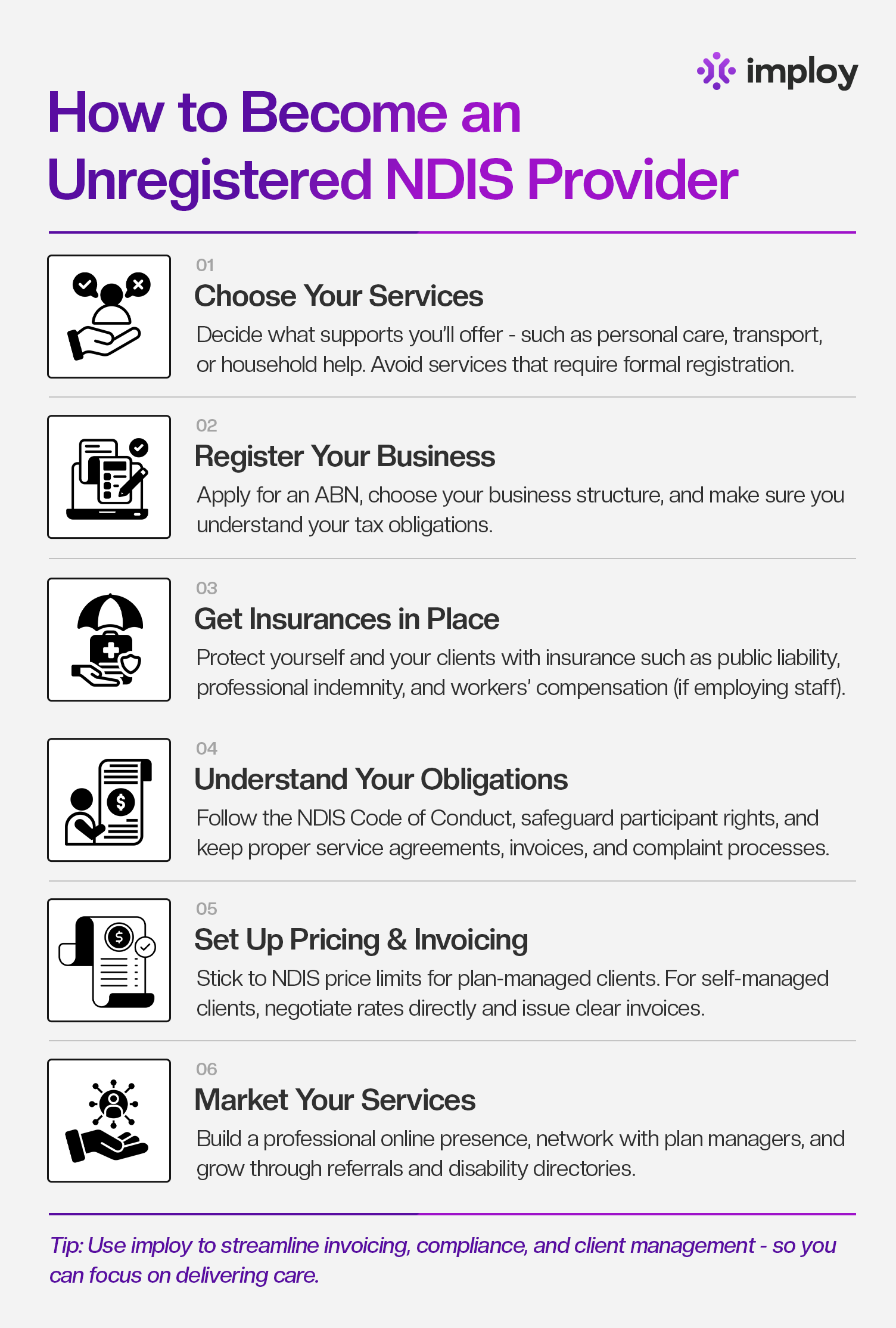 Discover how to become an unregistered NDIS provider in Australia. Learn the steps, benefits, responsibilities, and when to consider full registration.