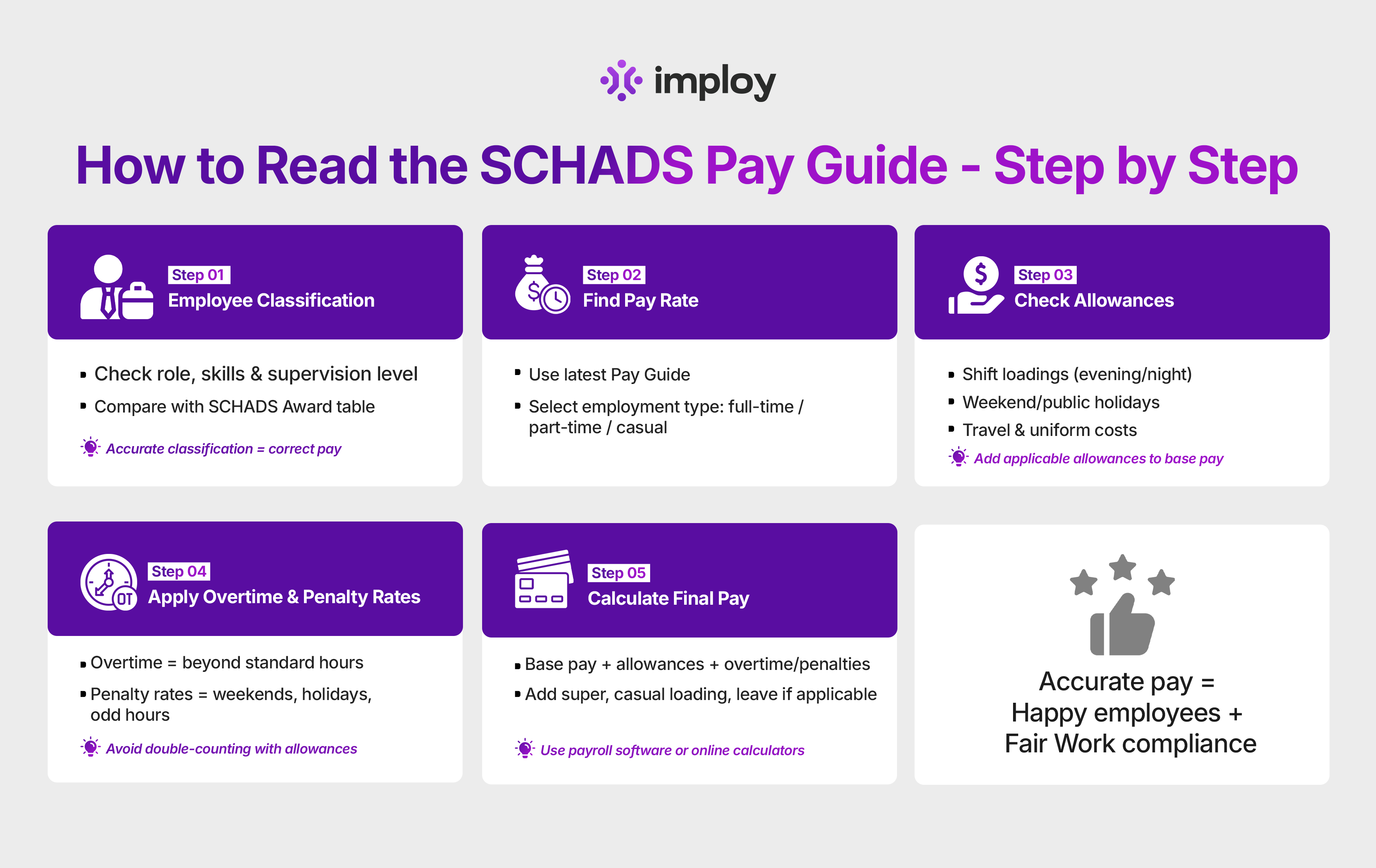By following these steps, employers can confidently read and apply the SCHADS Pay Guide, ensuring employees are paid accurately and fairly, and workplaces remain compliant with the Fair Work Act.