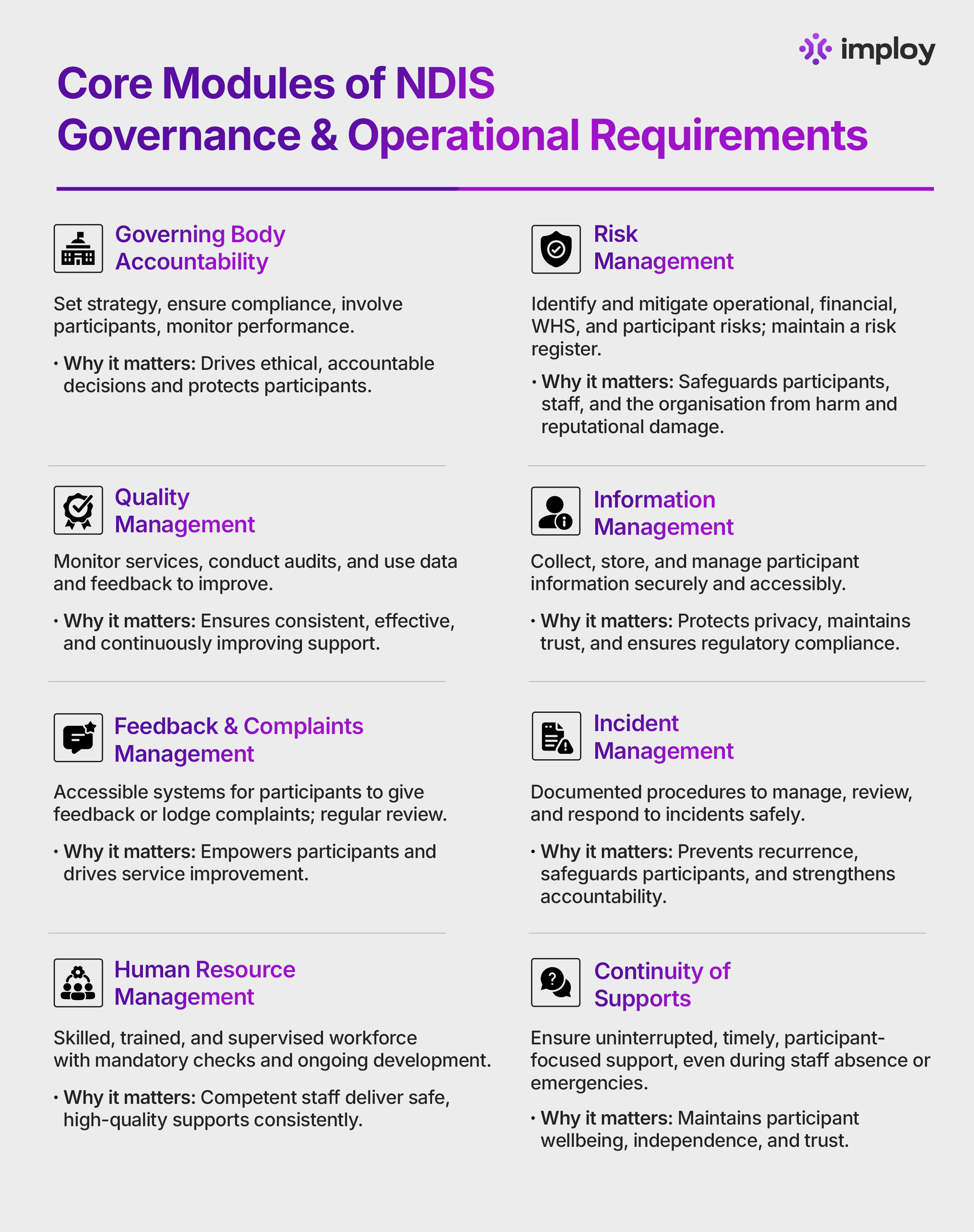 Why it matters: Quality management ensures services are consistent, effective, and continually improving, which directly benefits participants and supports organisational growth.