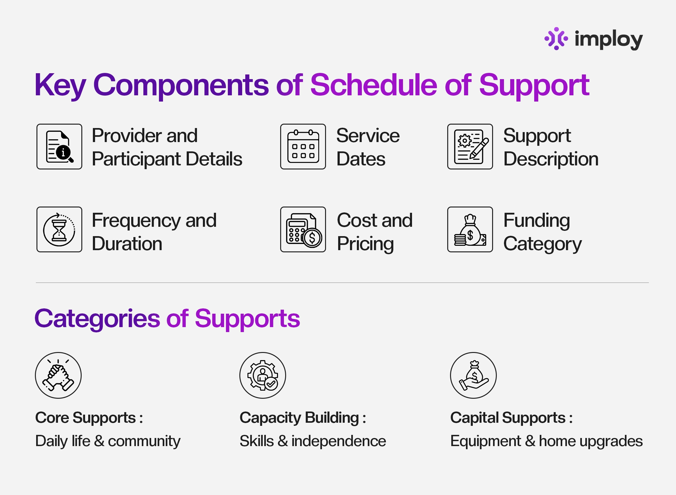A well-prepared Schedule of Supports clearly outlines all essential information to ensure transparency, accountability, and compliance with NDIS requirements. The main components include: