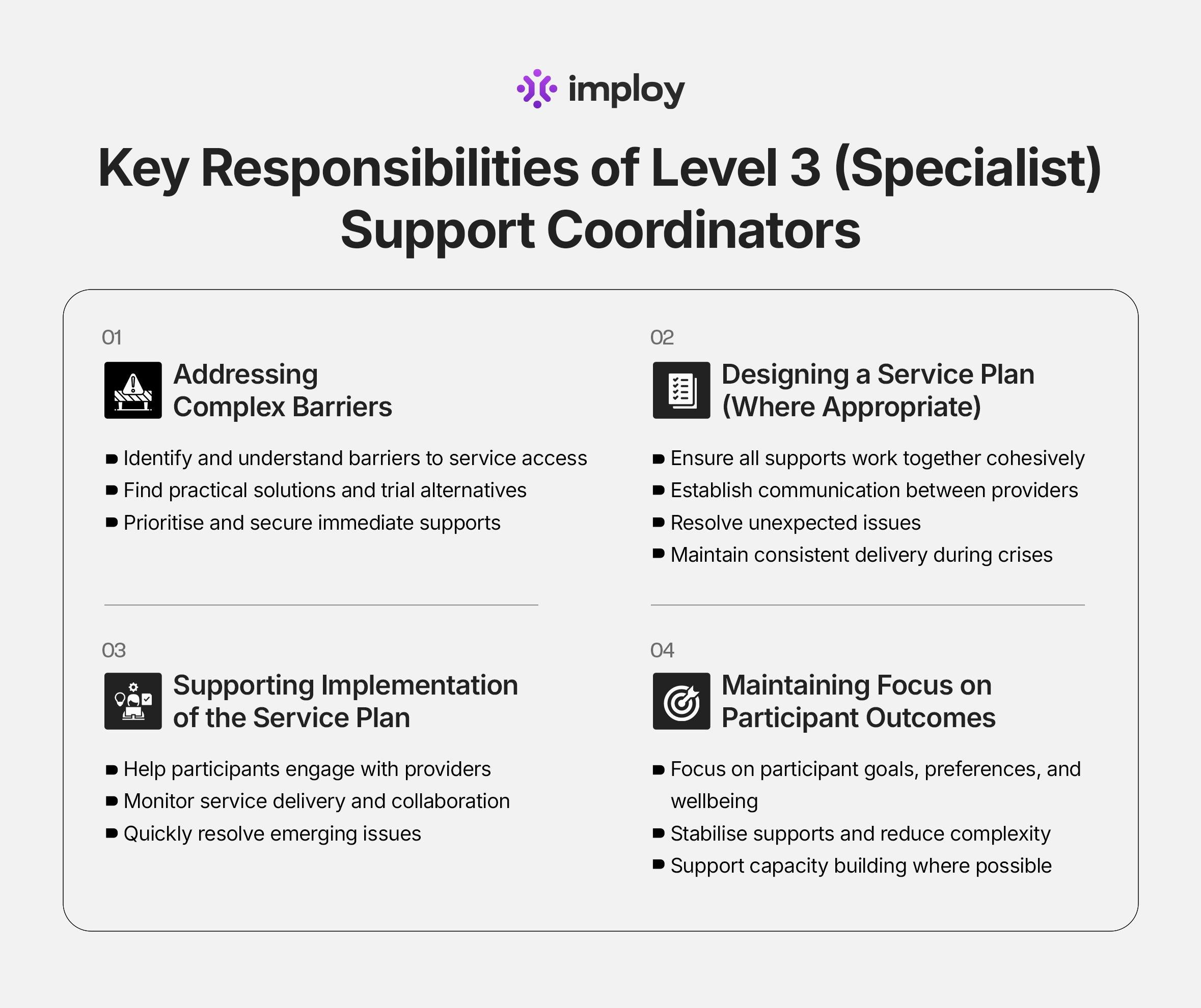 Managing high-complexity NDIS participants requires expert coordination, compliance, and payroll management. Imploy provides tools and services that make this easier for Level 3 Support Coordinators and their organisations: