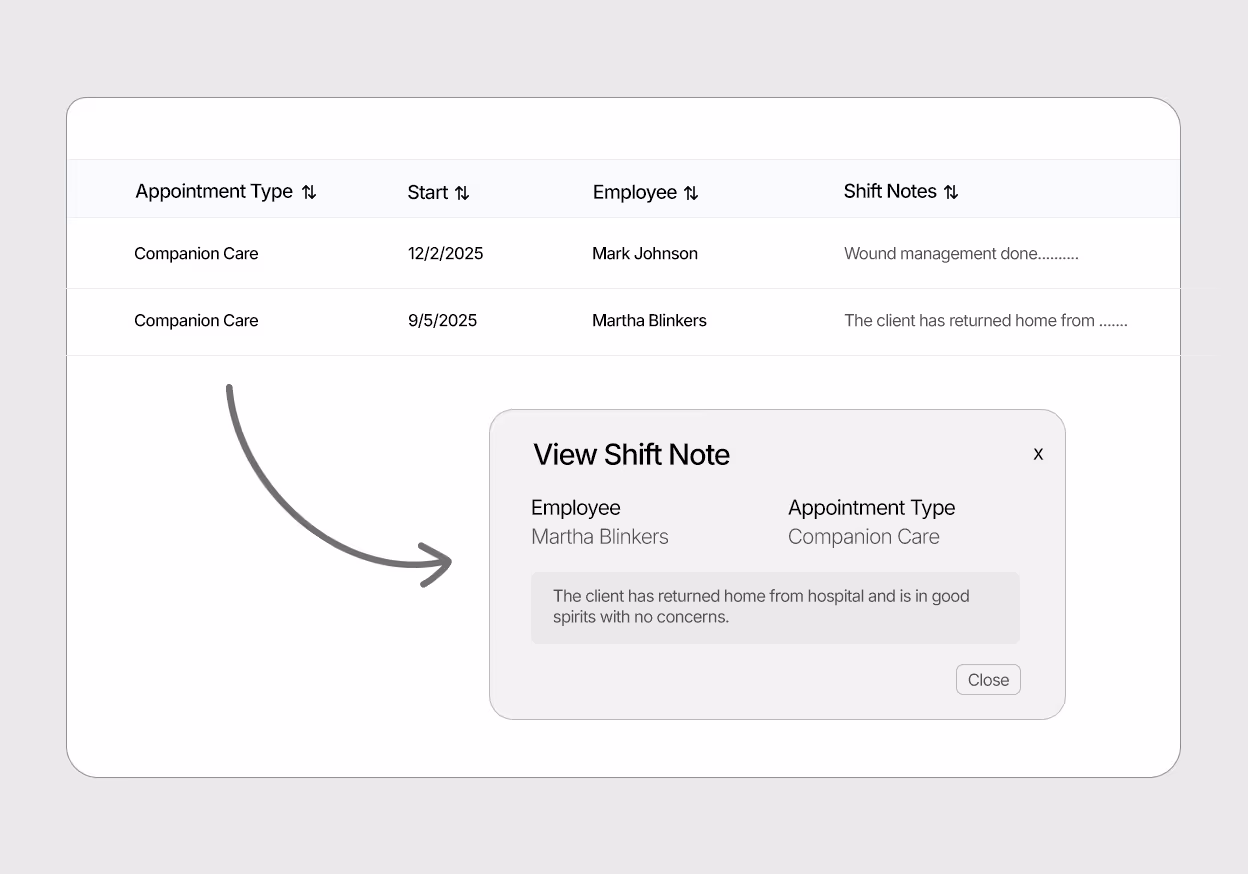 Keep a history of every shift. Staff can view participant goals and submit progress notes directly from the road.
